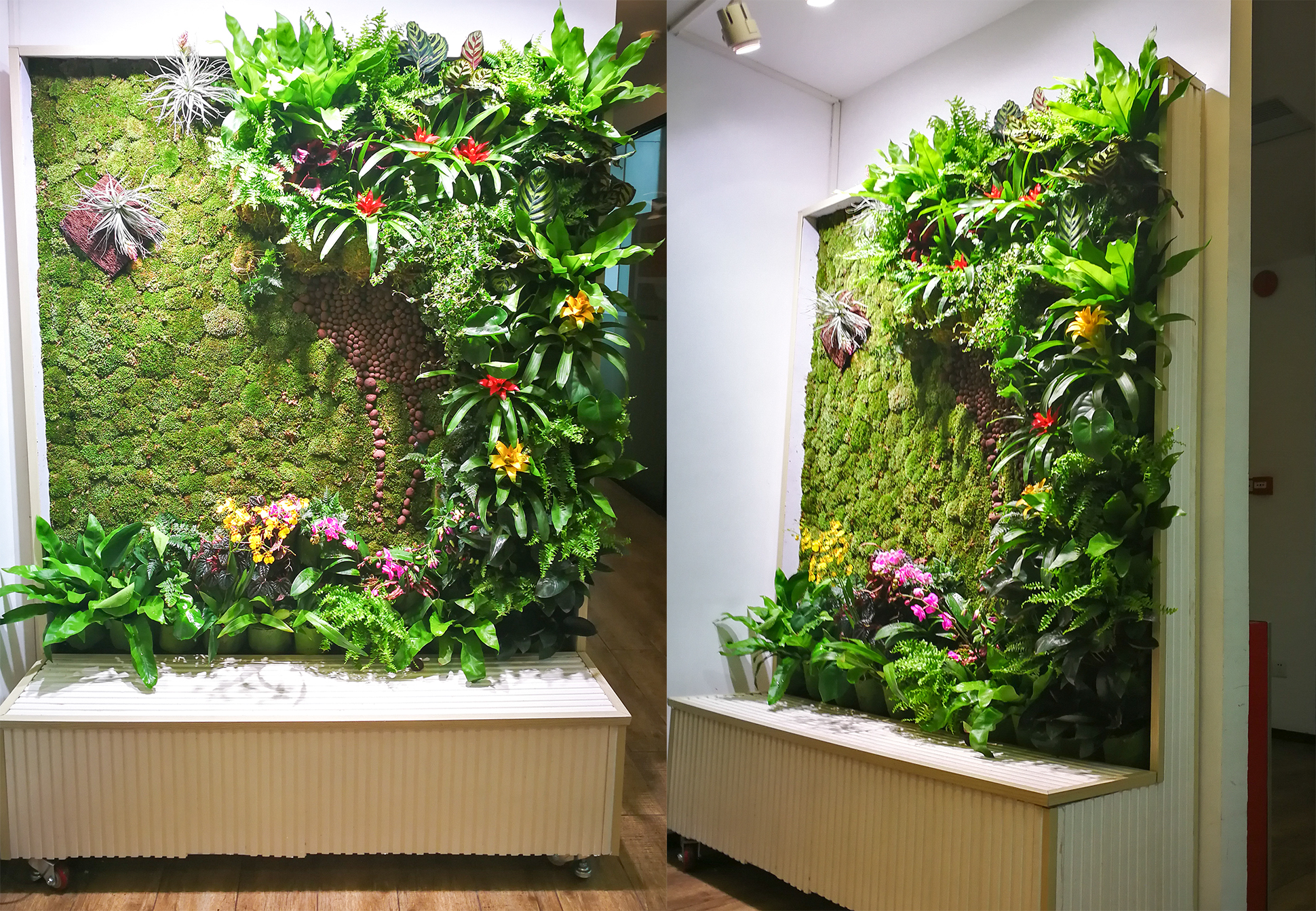 目前的苔蘚墻在立面上的固定方式尚不成熟,尤其是像白發(fā)蘚這類生長密集、墊狀叢生的苔蘚,隨著苔蘚層的加厚,容易在立面上脫落,同時(shí)還存在安裝拆卸不便的問題。本實(shí)用新型專利以此為突破口,顛覆了傳統(tǒng)垂直綠化模塊掛鉤式的固定方式,苔蘚墻成型后各模塊間獨(dú)立存在互不影響,解決了苔蘚墻模塊安裝拆卸不便和自然采集叢生類苔蘚易脫落等問題。