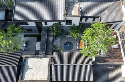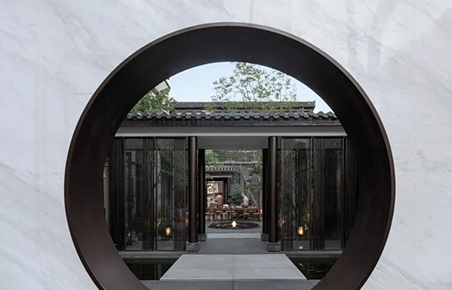 青磚黛瓦,雅致的建筑立面,大面積落地玻璃窗,模糊室內(nèi)外空間,院里綠意透入室內(nèi)。