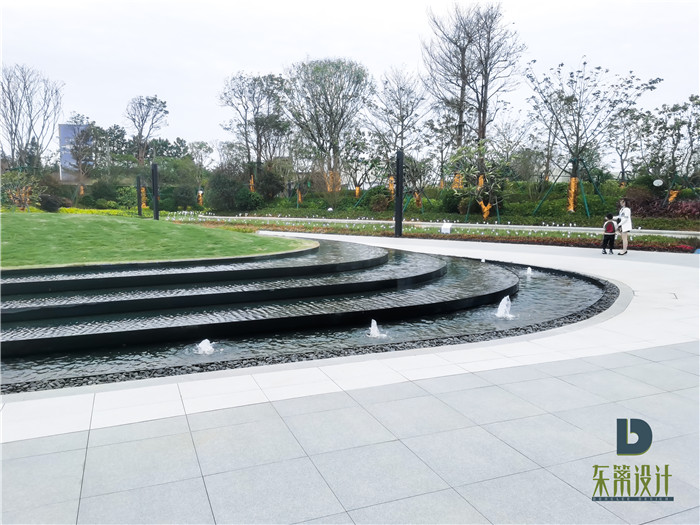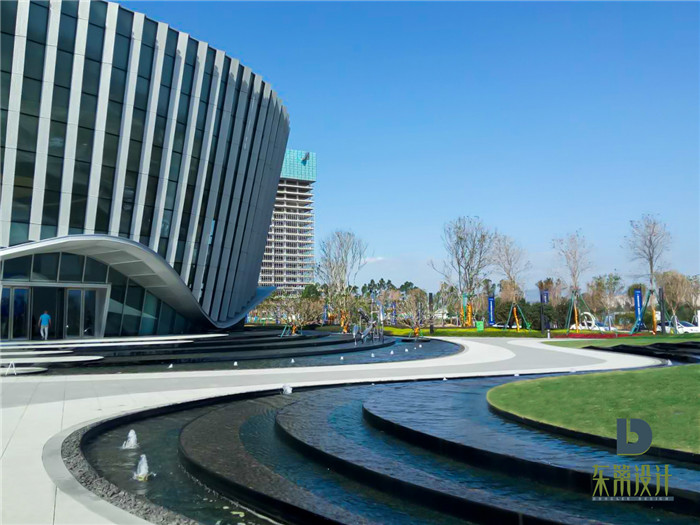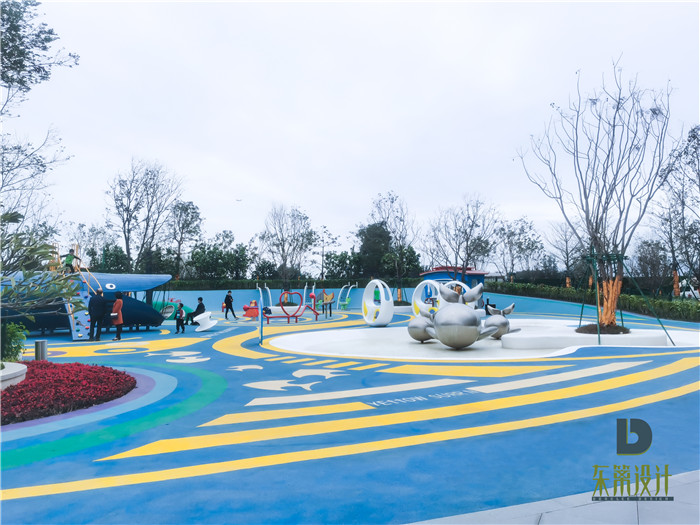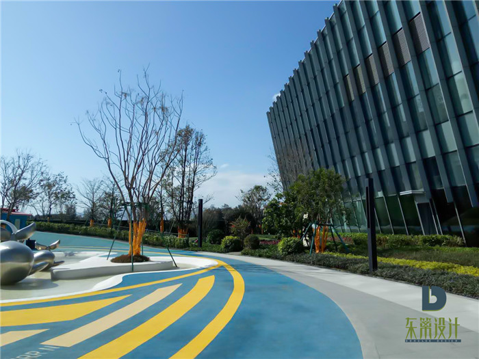 在景觀的打造中,以自然的律動(dòng)打造美學(xué)之感,柔動(dòng)的線條,噴涌而出的水柱,無(wú)不呼應(yīng)著海上生活的樂(lè)趣。金茂·智慧科學(xué)城,東籬環(huán)境將景觀和建筑空間進(jìn)行了深度融合。在游樂(lè)區(qū)空間建造中,采用高質(zhì)量的彩色塑料地墊進(jìn)行鋪裝。藍(lán)色的地墊,配合多種不同顏色的線條,打造靈動(dòng)之感。